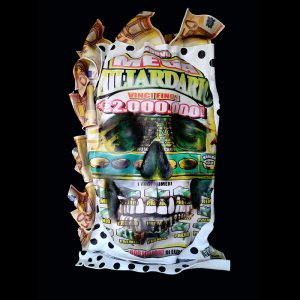 Materials: Acrylic colours, digital printing on PVC, various types of glues, hot, water-based, animal-based; Gold / Copper / Aluminum leaf, resins to simulate metals, water-based polyurethane resin, accessories in plastic material and final transparent.