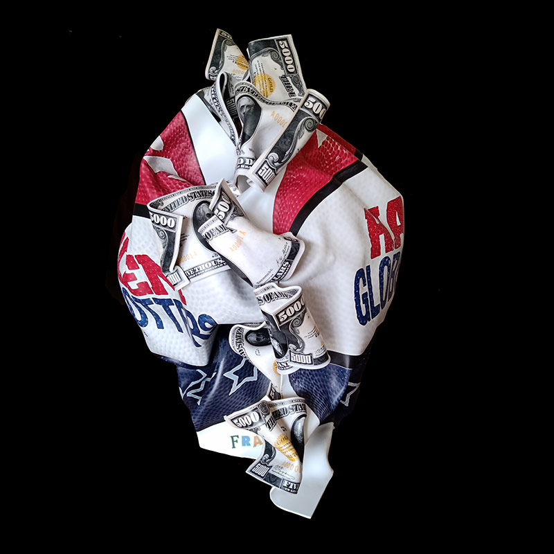 Materiali: Colori Acrilici,Stampa Digitale su PVC, vari tipi di Colle, a caldo, all'acqua, di animale; foglia Oro / Rame / Alluminio, Resine per simulare i metalli, Resina Poliuretanica a base d'acqua, Accessori in materiale plastica e Trasparente finale.